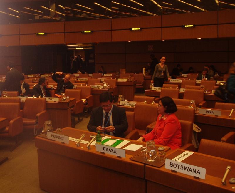 A break during the discussion of transnational crime and justice concerns at the UN Crime Commission meeting in Vienna.